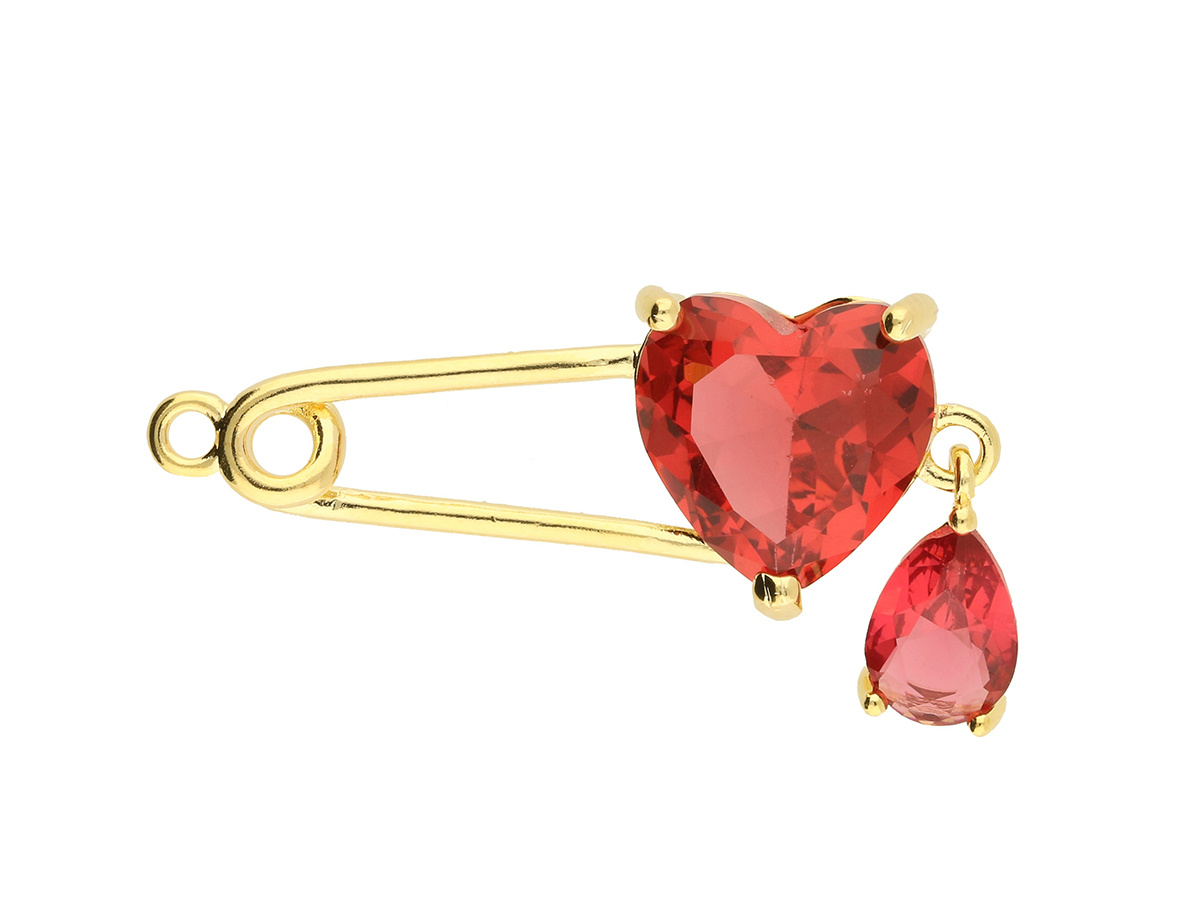 Agrafka z sercem / zawieszka / 26x11mm / miedź, kryształ / złoty, czerwony / 1szt