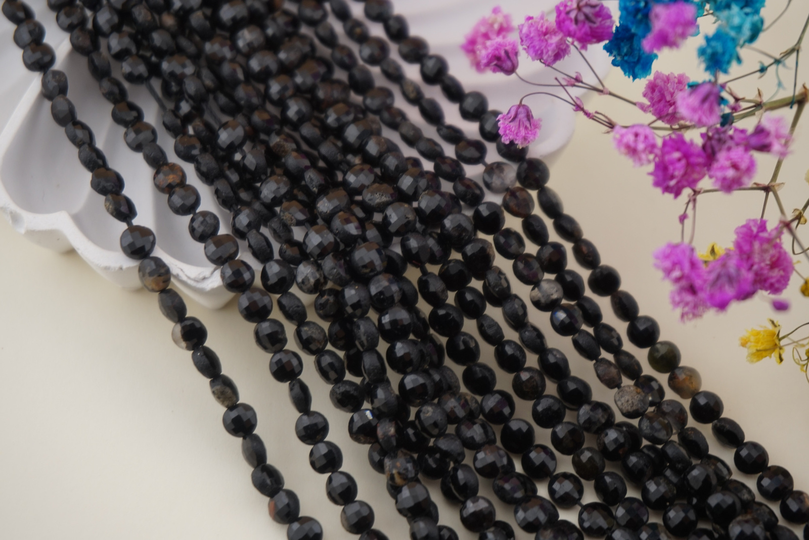 Czarny turmalin to naturalny kamień znany z głębokiego, jednolitego koloru i charakterystycznego, delikatnego połysku. W formie pastylki fasetowanej na sznurze wygląda niezwykle elegancko – fasetowanie rozświetla czerń subtelnymi refleksami, nadając kamieniom wyrafinowany wygląd.