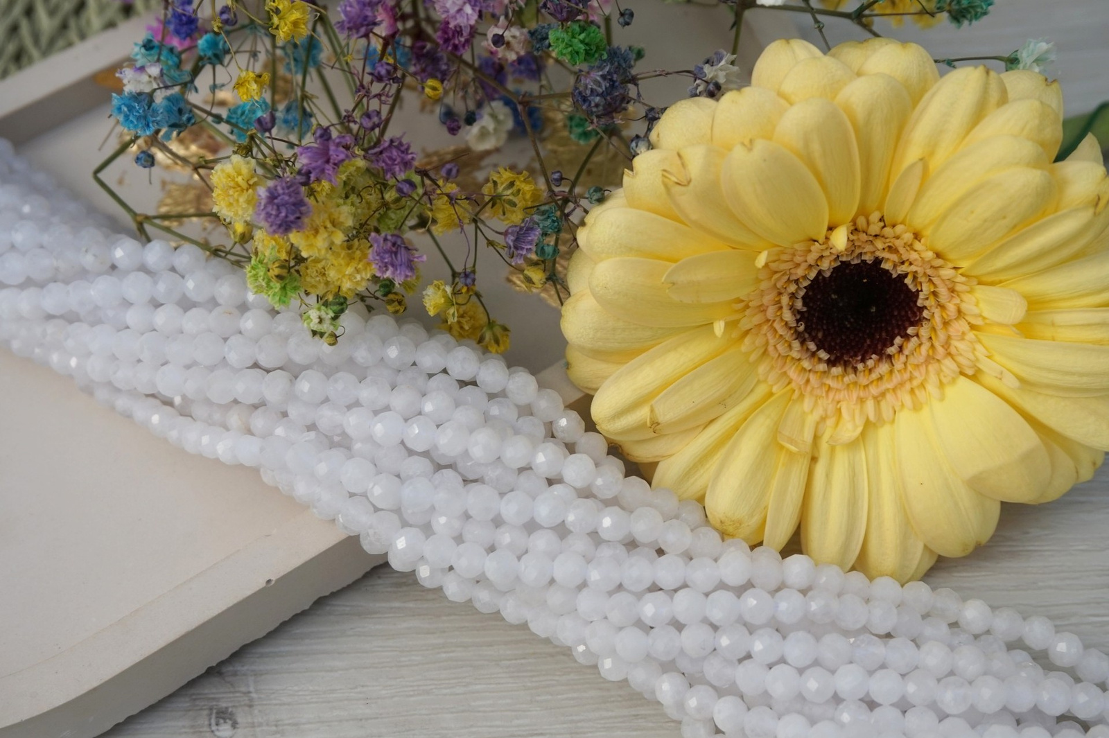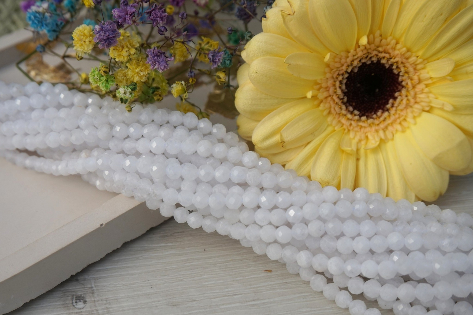 Jadeit biały (X0601) - bardzo ładny. Część koralików jest matowych, część przeźroczystych.