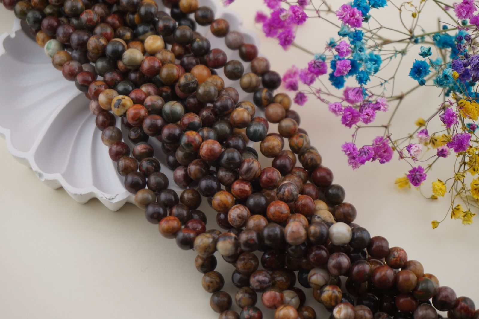 Jaspis Picasso świetnie nadaje się do bransoletek, naszyjników i kolczyków handmade. Doskonale komponuje się ze stalą chirurgiczną, miedzią, hematytem oraz drewnem.