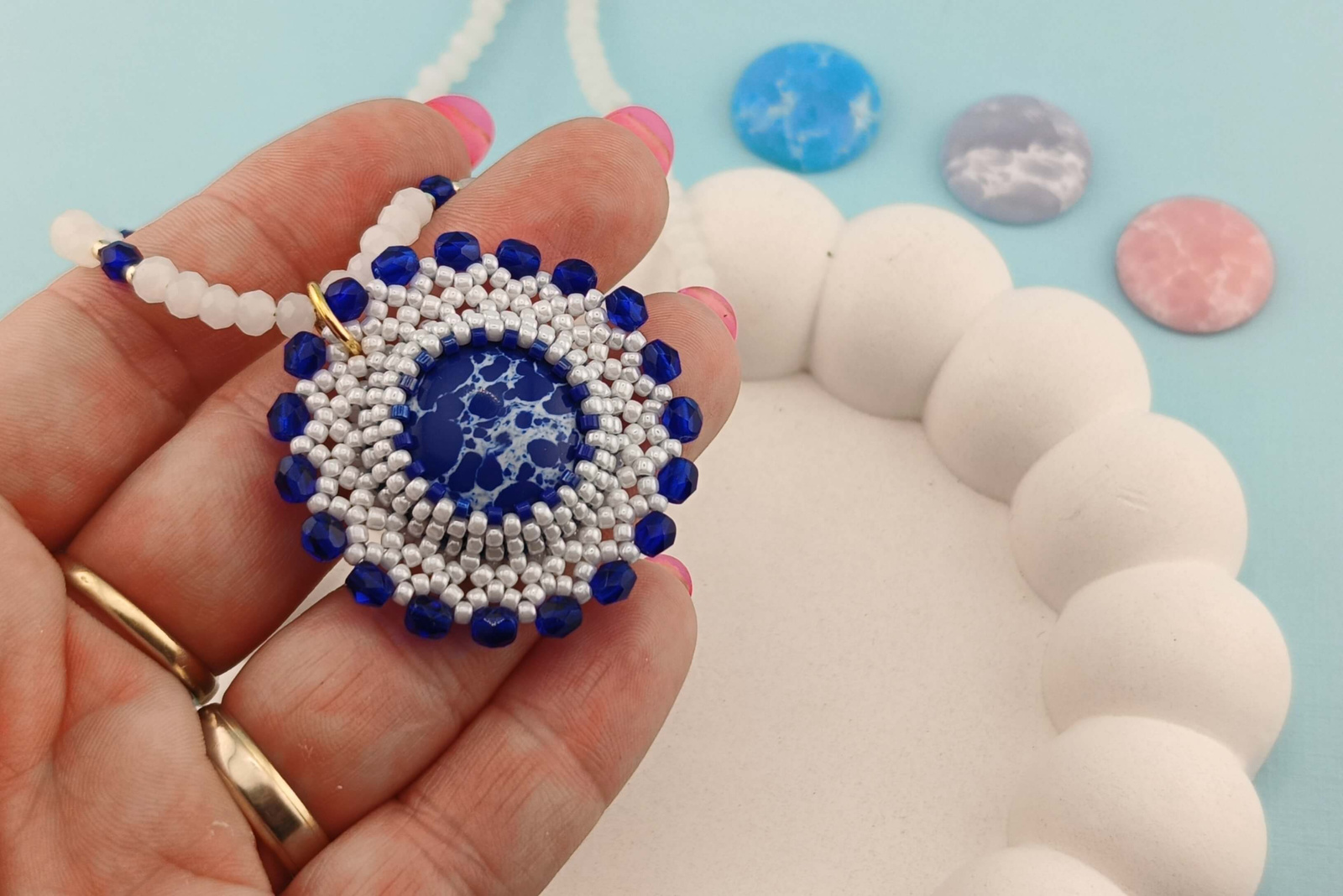 Kaboszon do oprawy sprawdzi się w wielu popularnych technikach tworzenia biżuterii:br> Beading – haft koralikowy wokół kaboszonu