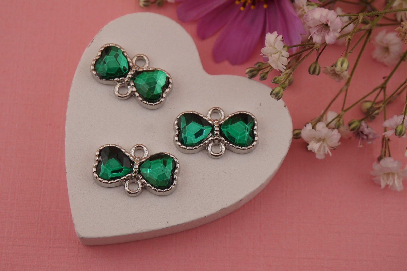 Kokardka z kryształkiem zielonym / łącznik / metal / srebrny / 10,4x16,8mm/ 1szt