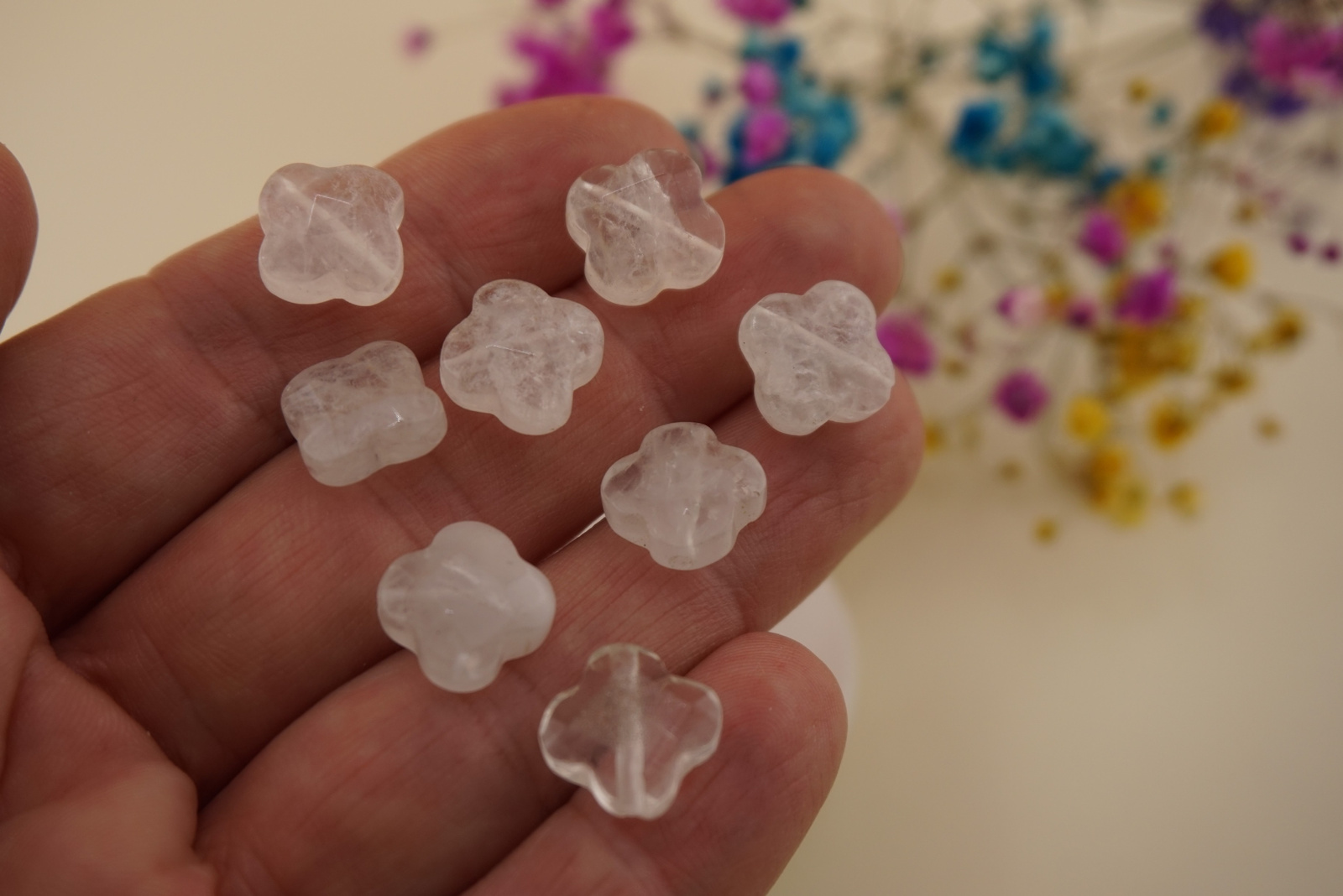 Kwarc przezroczysty to klasyczny, naturalny kamień o wyjątkowej klarowności. Jego szkliste wykończenie i delikatne refleksy sprawiają, że doskonale komponuje się z każdym stylem biżuterii. W formie fasetowanej koniczynki prezentuje się niezwykle elegancko – fasety subtelnie rozpraszają światło i podkreślają czystą, transparentną formę kamienia.