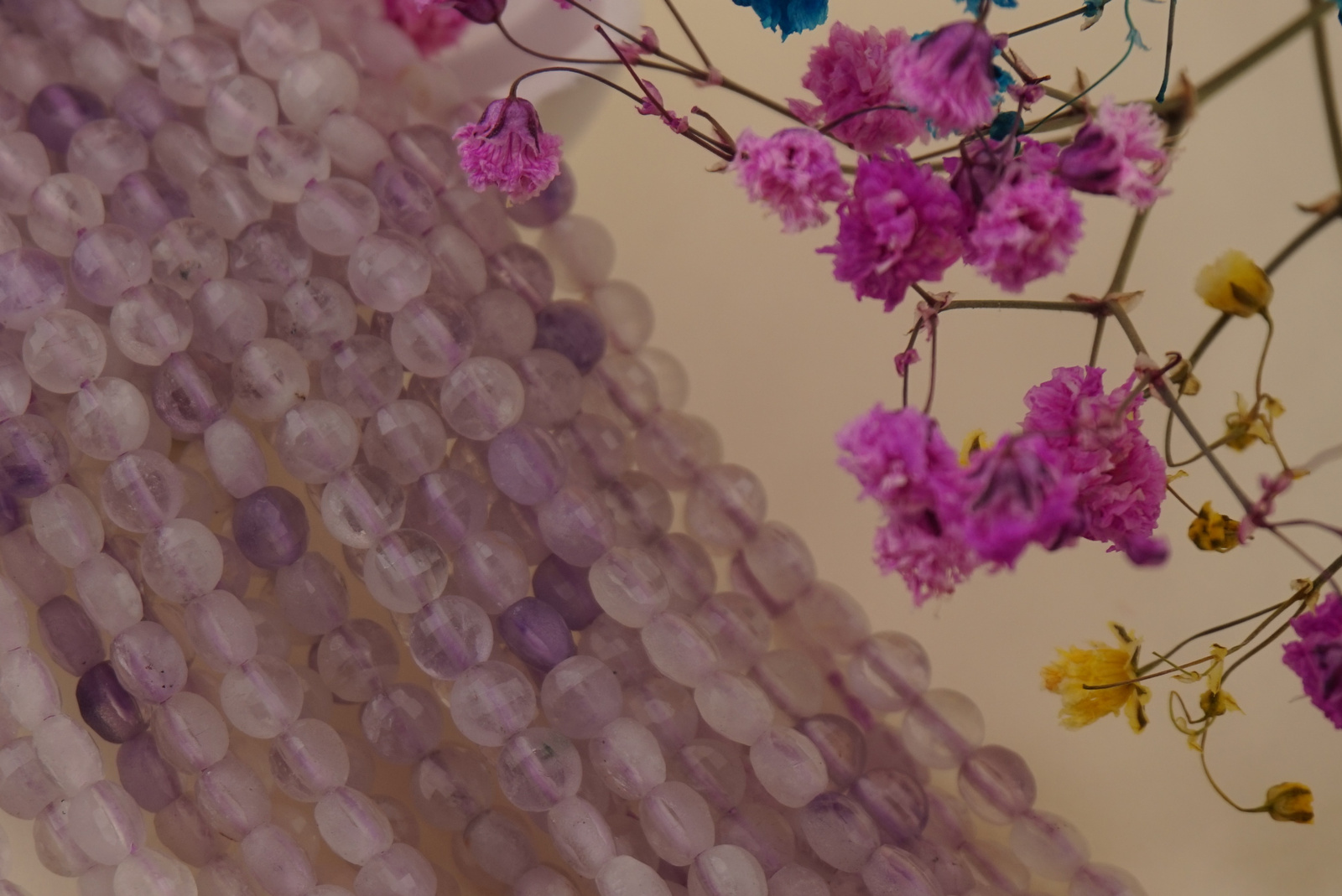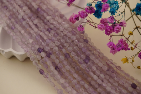 Kwarc syntetyczny fioletowy to dekoracyjny materiał, który zachwyca subtelną paletą barw. Odcienie jasnego fioletu, lilii i mlecznej bieli przeplatają się w półprzezroczystych koralikach, tworząc lekki, eteryczny efekt. Fasetowane pastylki pięknie odbijają światło i dodają projektom finezji.