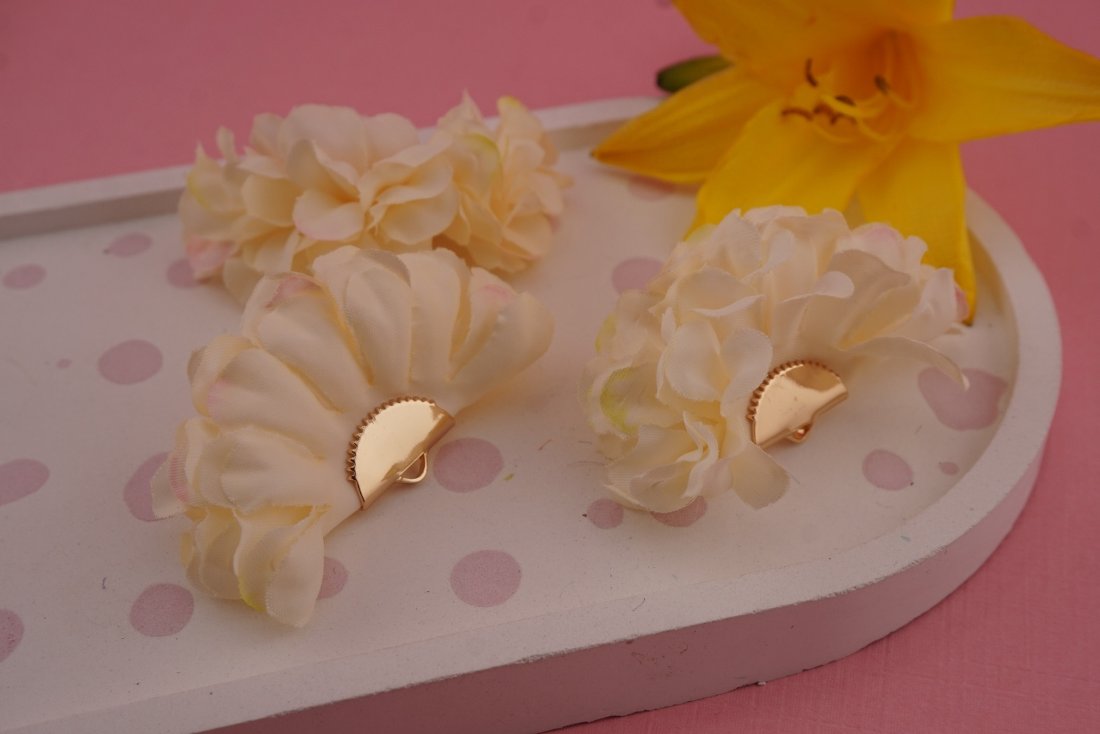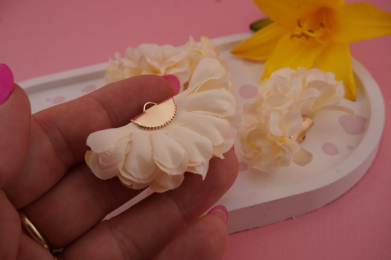 Nasza zawieszka kwiatek z materiału to uroczy, tekstylny dodatek, który świetnie sprawdzi się w tworzeniu wyjątkowej biżuterii – kolczyków, naszyjników czy ozdób do włosów. Wykonana z wyjątkowego materiału, zachwyca fakturą i kolorami.