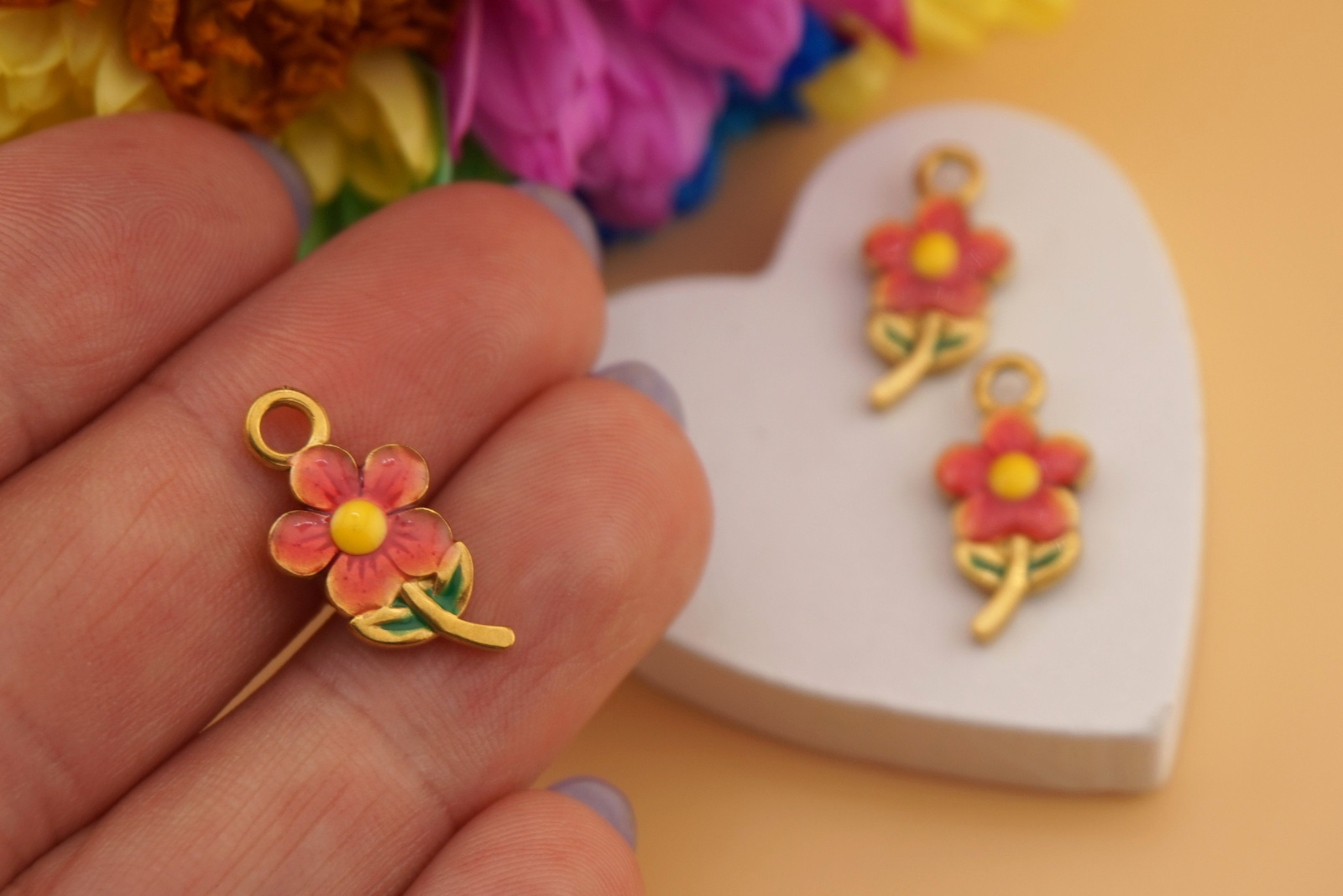 Kwiatek różowo - pomarańczowy / zawieszka emaliowana dwustronna / stal chirurgiczna / 20x10mm / 1szt