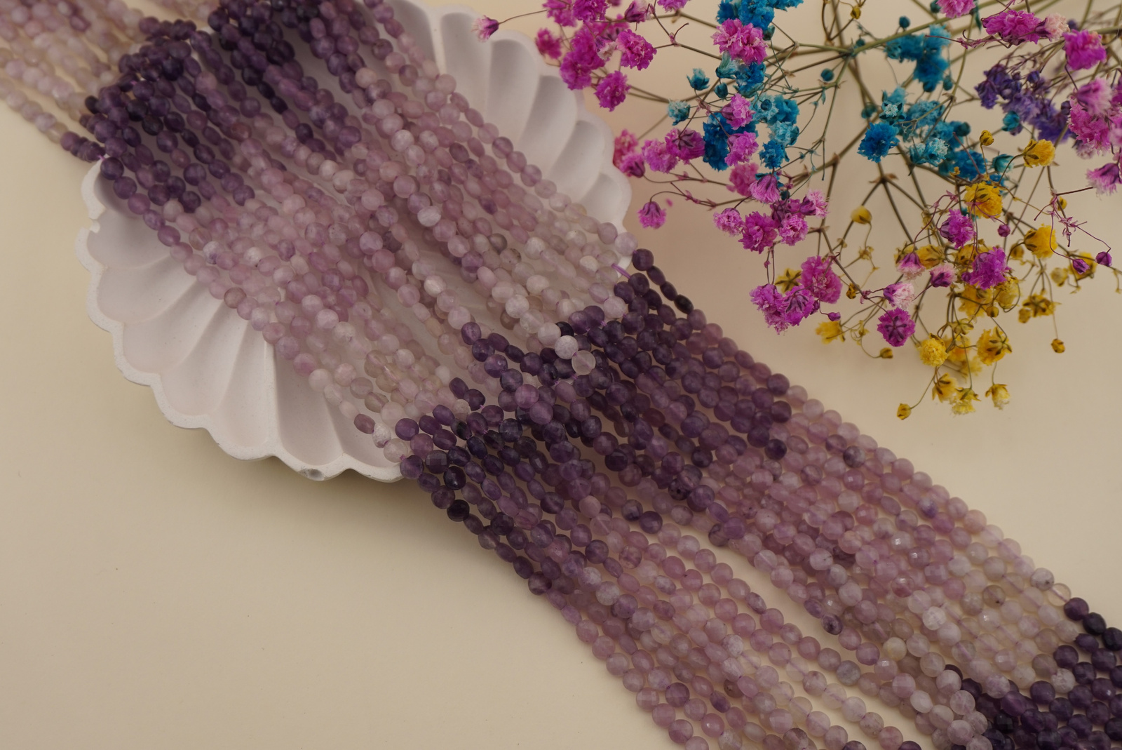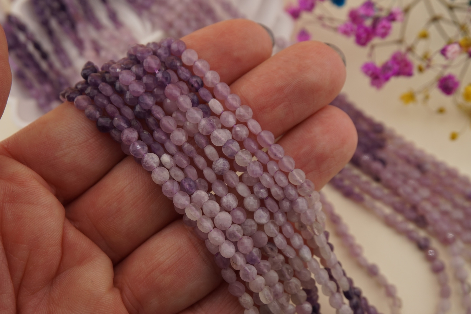 Sznur lepidolitu świetnie nadaje się do bransoletek, naszyjników i kolczyków handmade. Jego cieniowana kolorystyka doskonale łączy się ze stalą chirurgiczną, srebrem, hematytem i pastelowymi kamieniami, tworząc spokojne, delikatne projekty.