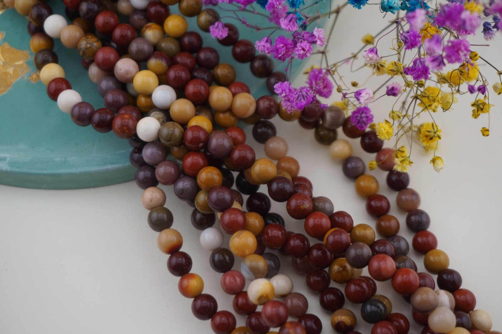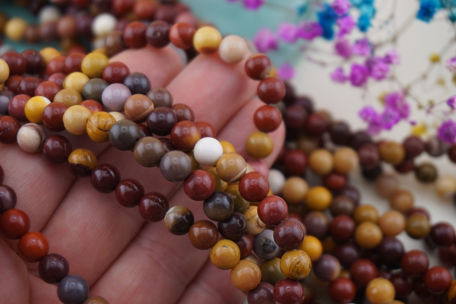 Gładkie kulki z mokaitu świetnie nadają się do bransoletek, naszyjników, charmsów oraz projektów boho i etno. Jego wszechstronna kolorystyka doskonale łączy się z drewnem, miedzią, stalą chirurgiczną, złotem i innymi kamieniami o ciepłych odcieniach.