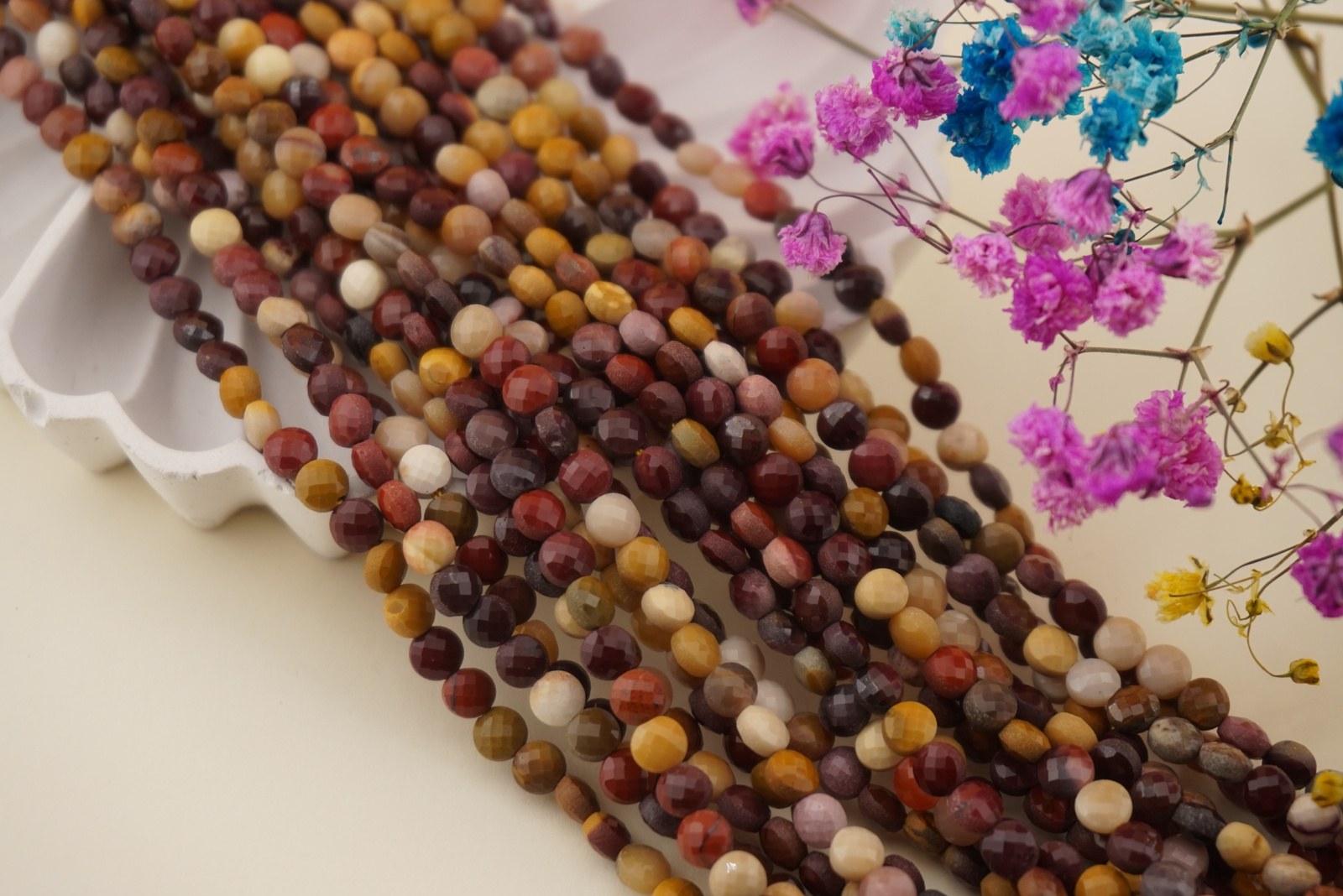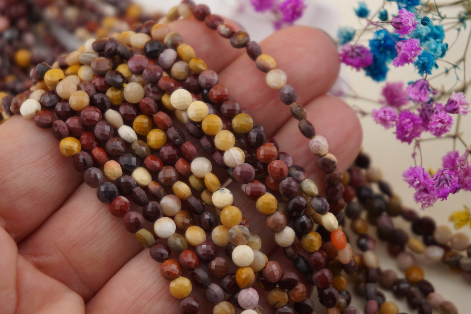 Mokait (mookaite) to kamień naturalny z Australii, znany z wyjątkowo bogatej i ciepłej kolorystyki. Łączy odcienie żółci, ochry, burgundu, różu, bieli i głębokich brązów. W formie pastylki fasetowanej na sznurze prezentuje swój charakter jeszcze pełniej – fasetowanie podkreśla naturalne przejścia barw i delikatnie odbija światło.