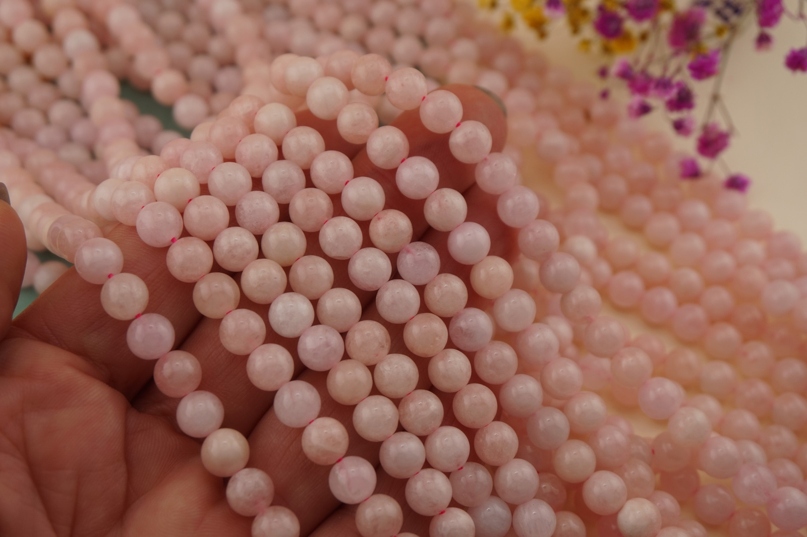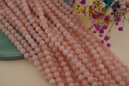 Morganit różowy to delikatny kamień naturalny ceniony za swoje miękkie, pastelowe odcienie różu. Gładkie kulki na sznurze podkreślają jego subtelny charakter i tworzą harmonijną całość, idealną do kobiecej, eleganckiej biżuterii.