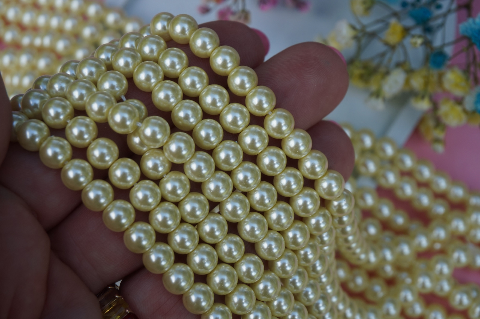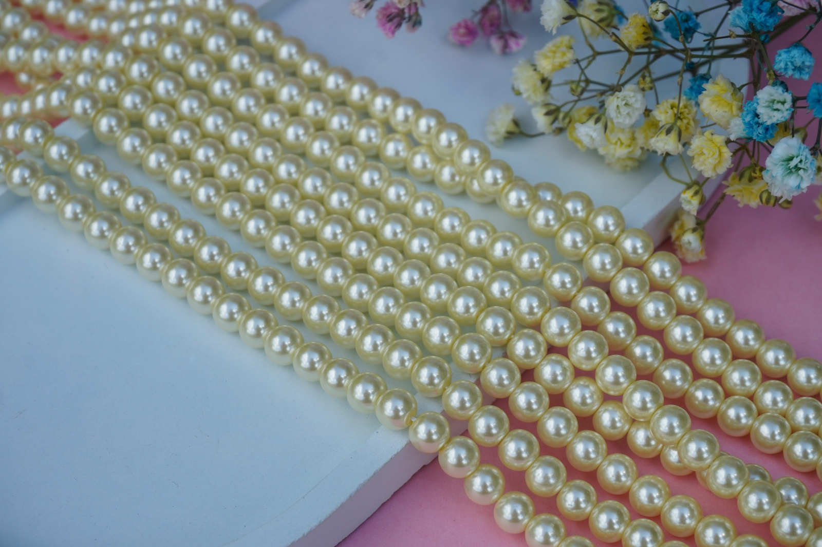 To koraliki wykonane z prasowanej masy perłowej – czyli naturalnego materiału pozyskiwanego z muszli. Ich powierzchnia pięknie odbija światło, tworząc efekt zbliżony do prawdziwych pereł.
