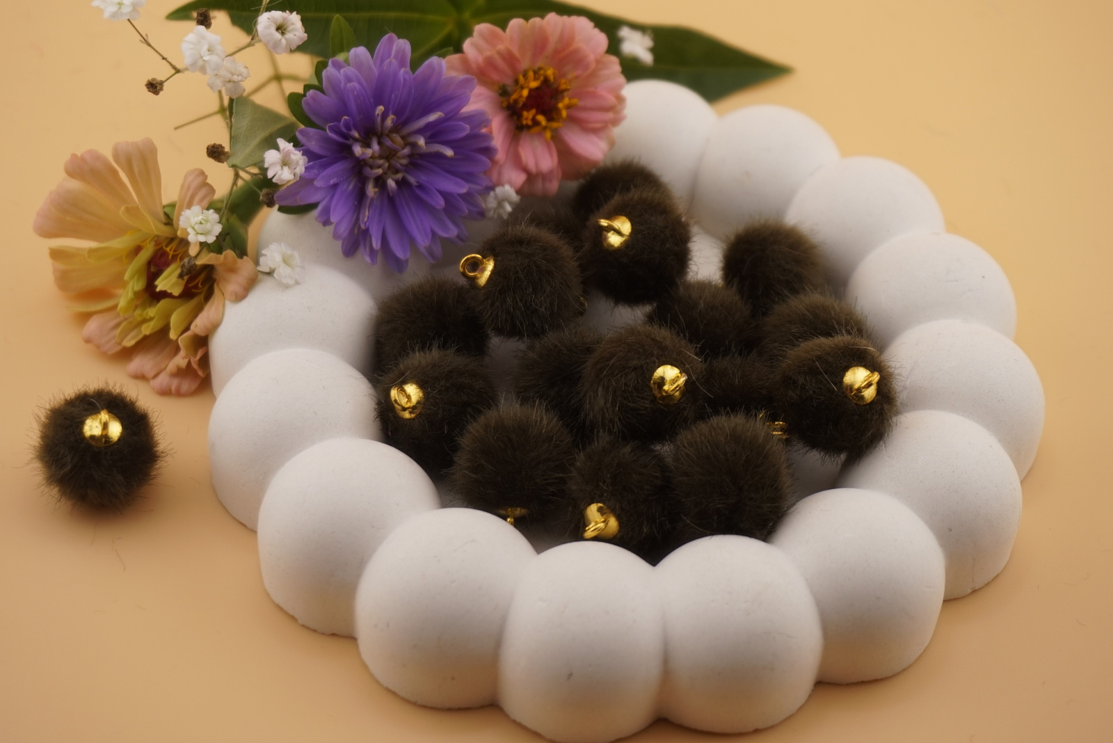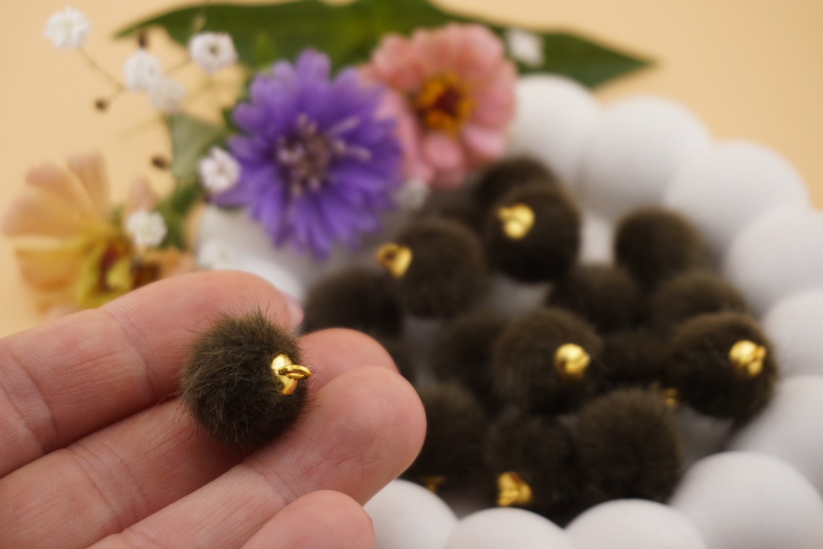 Zawieszki pompony z metalowym uchwytem to lekkie i efektowne ozdoby, które dodają biżuterii miękkości i koloru. Dzięki praktycznemu uchwytowi łatwo je zamocować w kolczykach, bransoletkach czy naszyjnikach handmade.