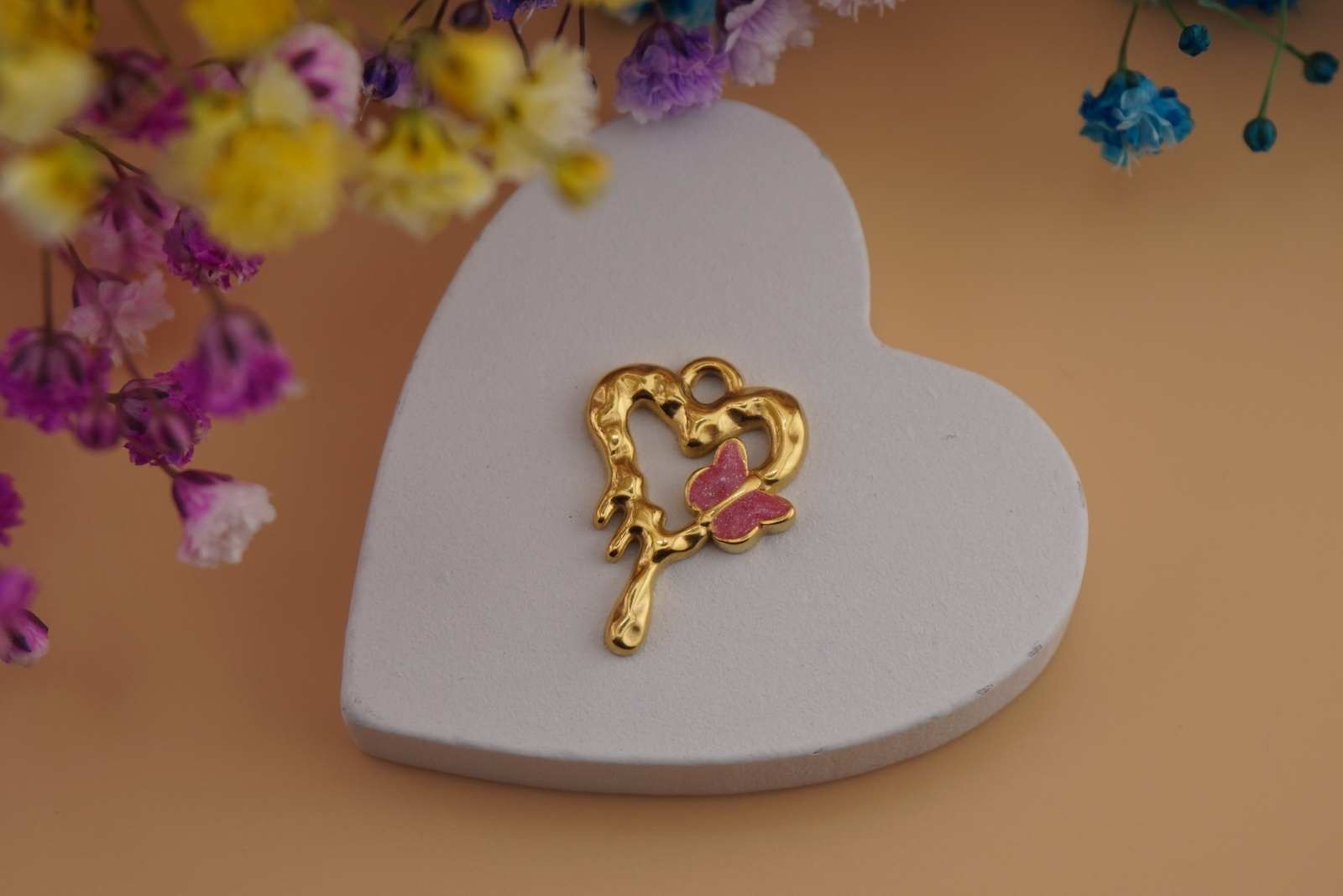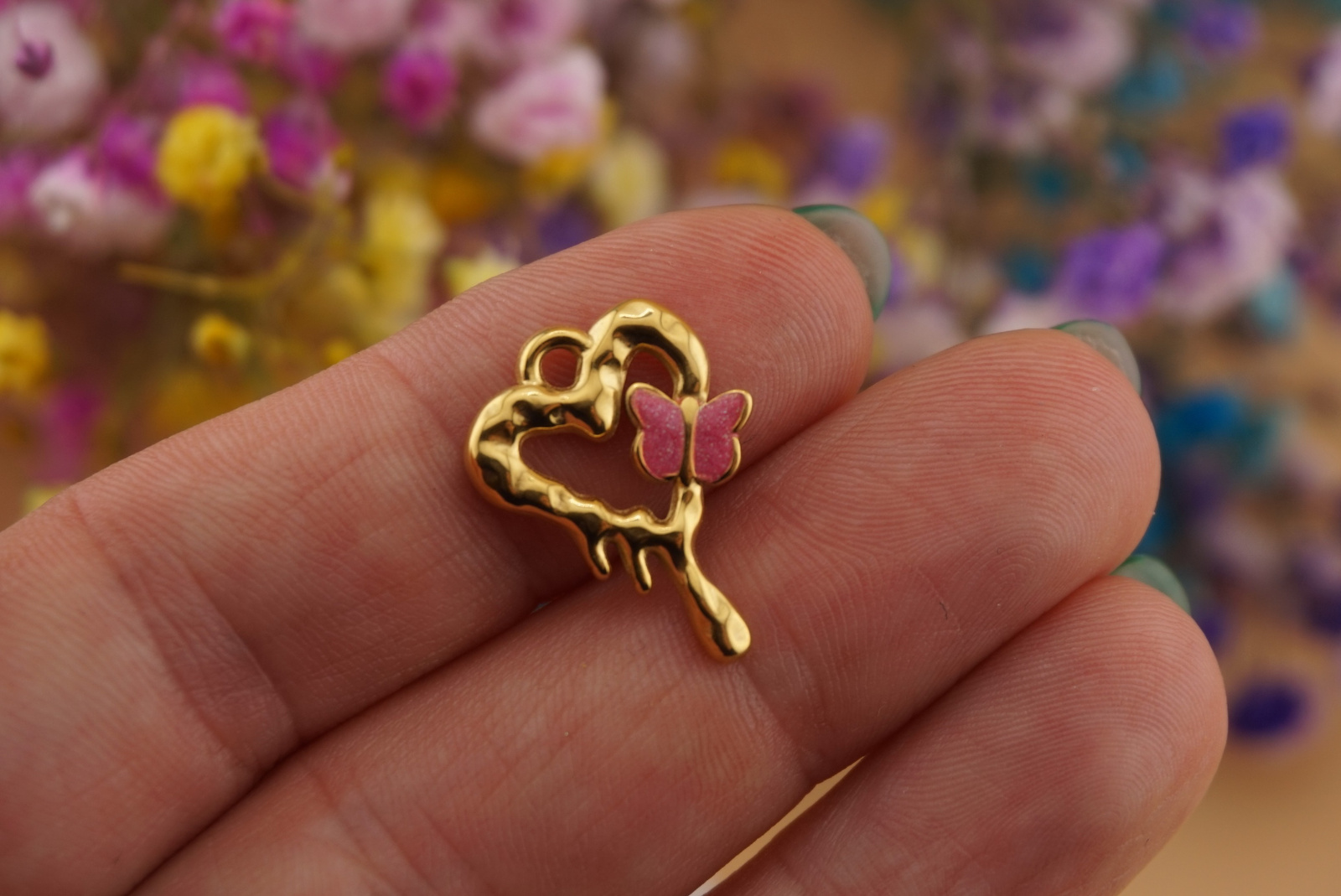 Serce z motylkiem różowym / zawieszka ze stali chirurgicznej / 21x15mm / złoty / 1szt