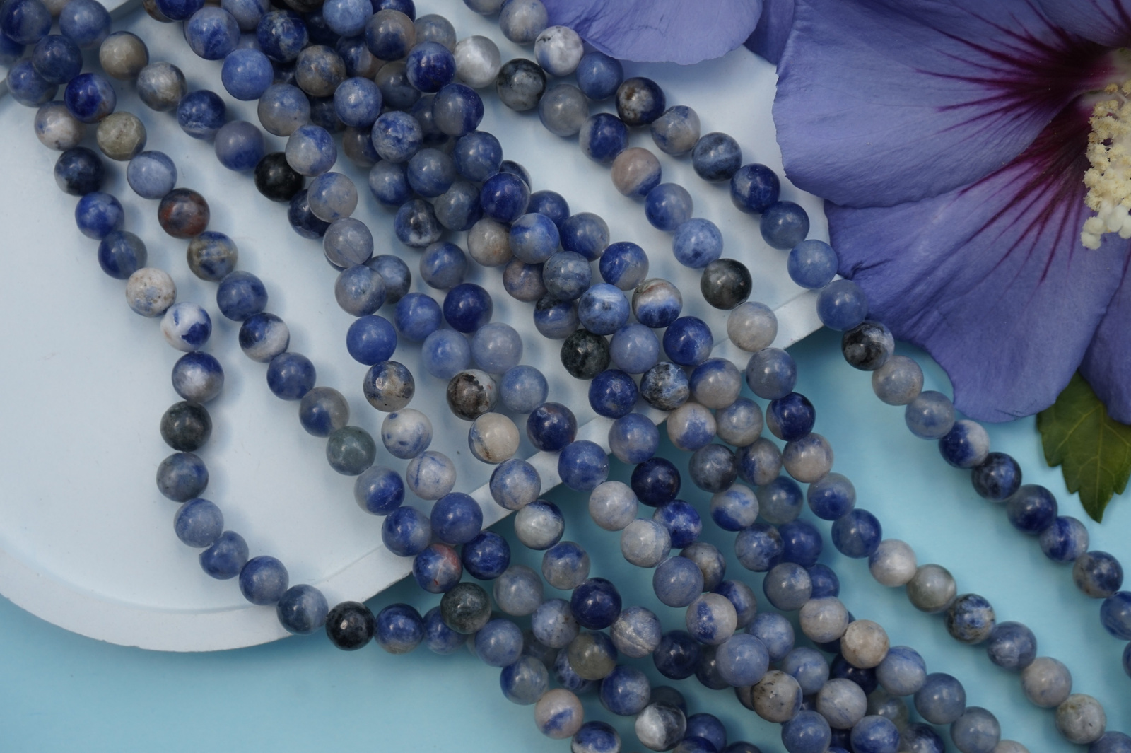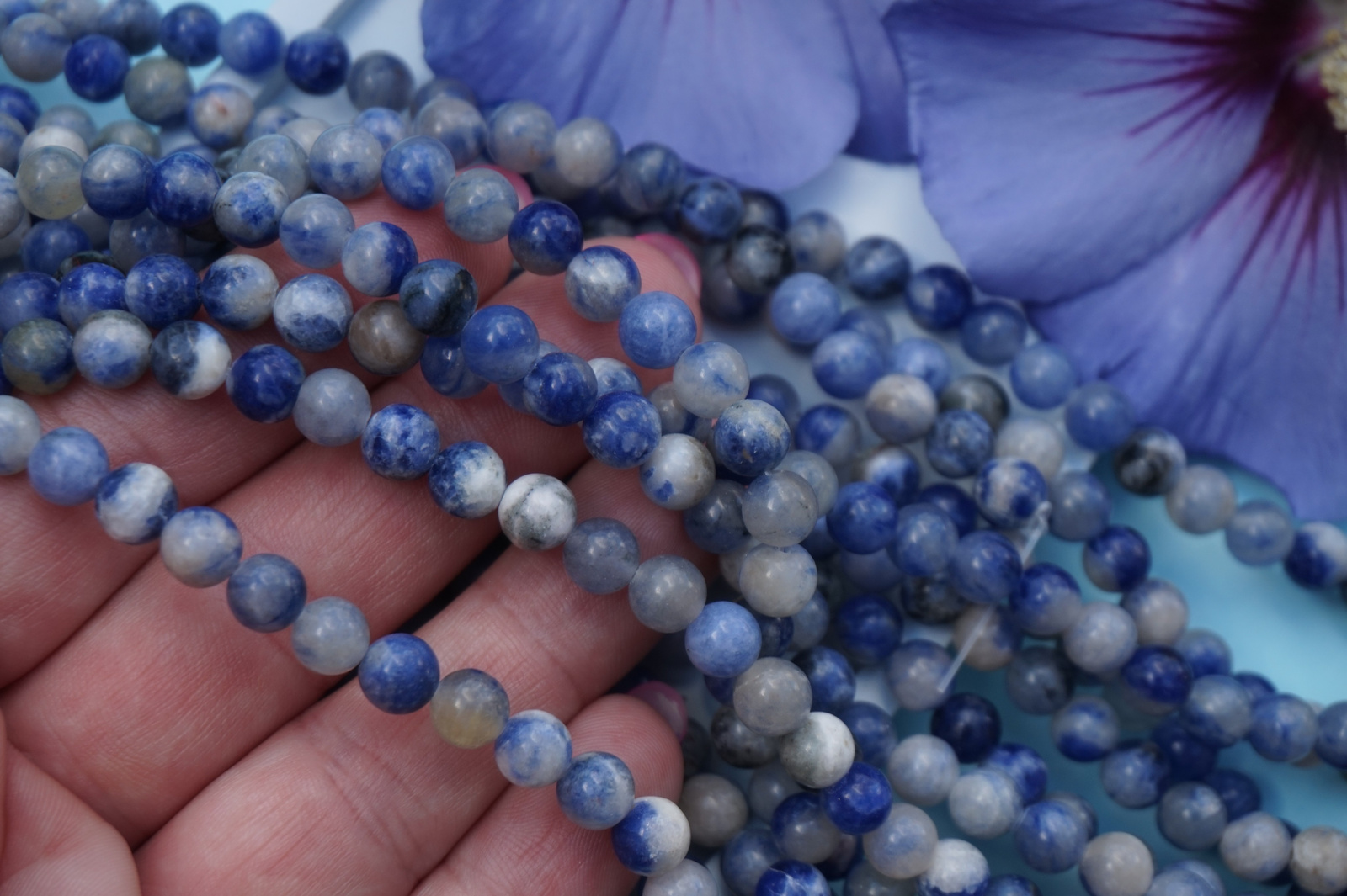 Sodalit to kamień, który łatwo rozpoznać – granatowy z białymi i szarymi żyłkami. Nie ma dwóch identycznych koralików, a ta niepowtarzalność dodaje biżuterii osobistego charakteru. Kamienie mają naturalną, lekko matową powierzchnię i są przyjemne w dotyku.